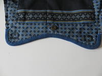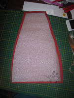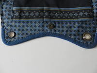 Кнопочки установили. Теперь складываем 2 заготовки – внешнюю и внутреннюю и, скалываем булавочками, а затем сметываем (для надежности). Выкраиваем косую беечку и окантовываем  верхнюю часть.
