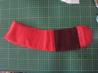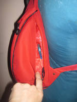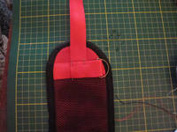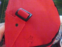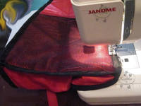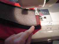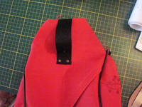 нижний срез кармана закрываем стропой, под нее вставляем стропу длиной 45см, сверху стропа с полукольцом.очень аккуратно нужно все это перестрочить,  толщина большая, можно все это сделать до окантовки лямки