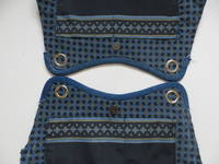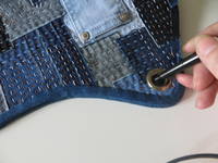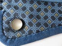 Ну вот, люверсы установлены. Соединяем вместе 2 части сумочки, сшиваем и, затем окантовываем их косой бейкой.