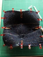Затем укладываем нашу заготовку лицевой стороной вниз на перевернутую тарелочку, центруем, и, как бы обхватывая её, закалываем прищепками вытачки с 4 сторон.