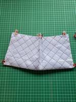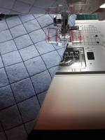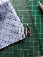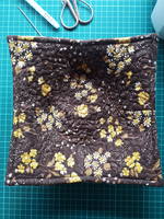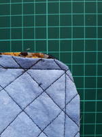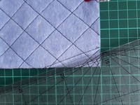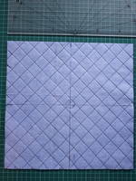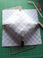 Далее нам нужно соединить ткань с наполнителем любым удобным для вас способом-простегать на свободном ходу, проложить строчки из угла в угол или простегать декоративными строчками. Для тех, кто как и я, стегать не умеет это отличный способ начать или лишний раз потренироваться! У меня слой с ватином простеган на свободном ходу, слой с салфеткой простеган квадратами простой строчкой. Отутюживаем заготовки, выравниваем при помощи роликового ножа обе части до одного размера-у меня 28см.