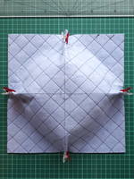 Далее нам нужно сделать по 4 вытачки на обеих заготовках, чтобы придать прихватке форму. Находим середину каждой из сторон и проводим через них линии исчезающим маркером.
