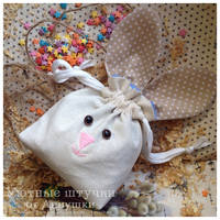 Мешочек - прямоугольник. Кроится 4 шт. 2 из лицевой ткани, два из внутренней. Можно всё из одной. Так даже лучше будет. Просто у меня мало было такой, я взяла для внутренней бытовую салфетку нетканую. Уши - кроятся 4 детали. Две из той же, что и лицевая мешочка, две из любой цветной. Уши складываются лицевымистороная внутрь. сшиваются, выворачиваются, отглаживаются. Размер ушей в ширину должно быть половина ширины мешочка минус 1-1.5 см. А высоту уж как глянется.