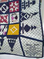 Когда в 2015 году начинала шить Джейн, то не знала что есть импортные ткани для пэчворка. Только разделительные полоски и синие лоскуточки на кайме из корейского хлопка, но тоже наверное не пэчворковского , т.к. шириной 1,5 м. На фон ушло  ИЗ СЭКОНД ХЭНДА 2 немецких наволочки и 1 с четветью пододеяльника. Все остальное ивановские и белорусские бязи, а синий с рисуночком в блоках вообще остатки советского штапеля (обрезки от давно изношенного халатика). Вообще у каждой девочки своя история ... С ними можно создать книгу. Собирала и стегала середину из 9 крупных блоков-сэндвичей. Каймы тоже пришивала ввиде сэндвичей к готовой середине. Размер получился 82х82 дюйма