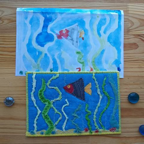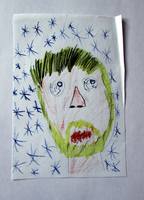 Вчера получила прекрасный рисунок 7-летнего сына Раисы, воплощенный мамой в текстиле. Такой обаятельный образ любопытного человека! Я в восхищении! К открытке был приложен и сам оригинал. Рая,  и не жалко было тебе расставаться с ним? Я тронута!