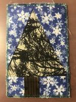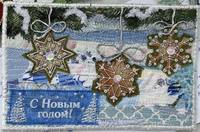Я тоже отчитаюсь по открытке Екатерины Ананенко, получила до праздников. Открытка замечательная, видно, что много труда Катя вложила. Тут и наборный фон, и бисер, и вручную пришитые подвесы пряников и снежок на ветках елки. Спасибо большое, очень люблю отсылки к нашей истории, когда пряники так вешали на елку. Наверное , и сейчас вешают!