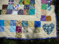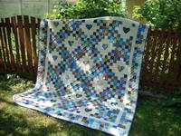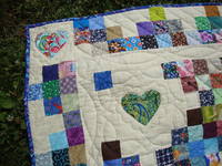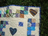 Действительно фрагменты такие разнообразные по цвету, а в целом синее. Очень понравились сердечные вставки, ручная стежка и квадратики классно легли, что в основном теле, что в кайме.