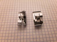 Вот мои лапки: ограничитель на четверть дюйма и оверлочная (она немного отличается от той, что ты ссылку дала, но принцип тот же. Отбойник по краю ткани и проволочки, не дающие стягивать шов нитками)