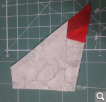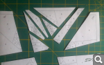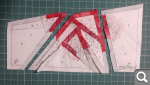 Но тут есть один нюанс. Посмотрите на цветную схему, в блоке D, крайние левые элементы идут отдельными мультиблоками. Это три чисто фоновых и один махонький зеленый элемент вверху. По идее, нужно было приложить их на ткань, приклеить, обрезать и пришить к готовой части блока. Но есть способ проще. Вы прикладываете к готовой части кусок ткани, пришиваете его, разворачиваете, проглаживаете и уже на него приклеиваете деталь схемы из фризера, затем обрезаете с обычным припуском.