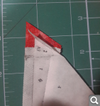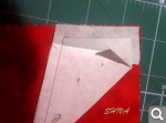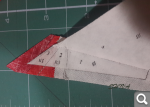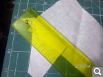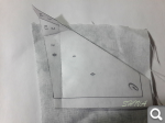 Накладываем кусочек под №1 на изнанку ткани и приклеиваем его утюгом. Удобно пользоваться миниутюжком, но можно делать это и кончиком обычного утюга. Затем загибаем по всем линиям последовательно и обрезаем с припуском четверть дюйма