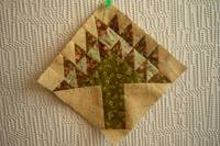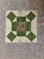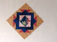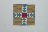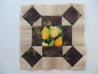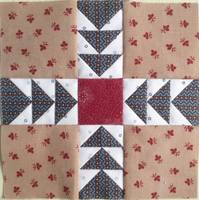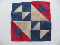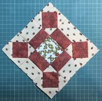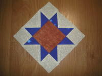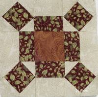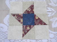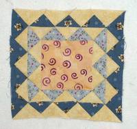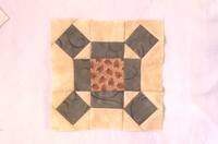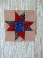 Далее смотрим на схеме в самую середину, там у нас расположен блок "квадрат в квадрате". Чтобы вновь избежать сшивания деталей по косой, и получить некоторый запас для подравнивания блока, выкраиваем для детали Н квадрат 3", а для деталей В - четыре квадрата в 2". На изнаночной стороне квадратов в 2" обозначиваем одну диагональ. Пришиваем 2 маленьких квадрата на большой по линии диагонали следующим образом: