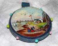 The pinkeep idea of today came from what was called a pindisc. It was a round wheel with ivory, wood or silver ends. In the center was a soft center (many antique examples are velvet centers) where the pins were inserted into the disc. The ends kept the pins points tucked inside. This was an safe and easy way for women to place their pins in the pocket of a dress.The pinkeeps stitchers make today are for decorative purposes. It is fun to collect trims and ribbons as well as pretty glass head pins that will match.