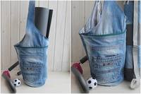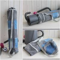 С осени я хожу на пилатес. Коврики, конечно, в зале есть, но мне хотелось свой. И хотя зал в соседнем дворе, встал вопрос о транспортировке коврика. Не покупать же чехол!  :laugh2: Сначала я посмотрела в интернете, что хорошего на эту тему придумано до меня  :good: Нашла сумку. Спасибо производителям и интернет магазину. они её сфотографировали со всех сторон и написали размеры  :crazy: Сшила, добавив от себя карманы. Оказалось, что не очень-то удобно, да и ручка коротковата. Ручку перешила. Сумка из старых джинсов, подкладка  - рубашка. Сплошная утилизация  :blush: Она открыта сверху, что не очень удобно, зато есть место для всего остального.