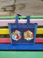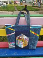 .   У самой только лоскутков два огромных ящика, не говоря уже про ткани, но это же от другого человека.  Долго раздумывала и решила, что надо их немного построжить. Построжила тёмной рубашкой моего племянника. Получилось шесть блоков уже прямоугольных. Из них сшила две сумки для покупок. Это первая сумка. Сшита из прекрасных огромных джинсов, купленных в секонде за 150 рублей штука. Это была невероятная удача. Размер наверное 60, прямые, без эластана, судя по состоянию этикеток не ношенные. Их было в магазине три штуки. Купила двое штанов. Сейчас жалею, что третьи не взяла. Внутри ткань от свадебной рубашки моего мужа, покрашенной в ходе одного из экспериментов. Окантовка из маминой двойки: сарафан и болеро, которую мы с сестрой тоже немного носили. Блоки простеганы и собраны между собой полосочками ткани. И все части сумки так же сшиты между собой - полосками, с изнанки пристрочены декоративным швом. На изнанке ручки набор так же из подаренных блоков. Распорола и сшила в ленту. Внутри предполагается подвесной карман, пока не сшила. Кроме джинсов, на сумке из нового: ткань для полосок на лице, молния, паутинка для скрепления топа и Бэка, нитки.