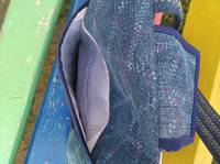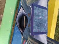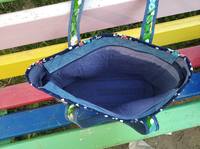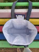 Эта сумка более дачный вариант. И совсем уже эко-эко.  Сшита из сильно поношенных джинс и двух мужских рубашек на подклад. На внешней стороне два кармана, один на молнии, второй открытый. Внутри каждого из них ещё по кармашку, родных, оставленных на кусочках полочек от рубашек . Внутри карманов нет. В этой сумке из покупного: кусочек новой ткани на кант, бегунок на молнии (сама молния остаток от другого проекта), кнопки на хлястике, вискозная салфетка и часть ниток ( правда дорогих - это проба из купленного мультиколора, остальные нитки - советский раритет). Ленточки нашиты не просто так, а прикрывают пятна на джинсах и потертости.