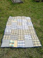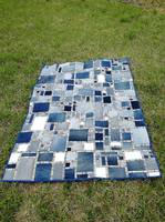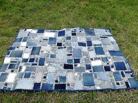 Зато при чистке полок разобрала одну полку наполовину: полку со старыми драными джинсами. Сшился у меня такой пледик. Размер 125 на 175. И даже кусок ненужного синего тика пригодился в качестве окантовочной бейки .
