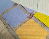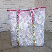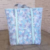 Сшила себе сумку для походов в магазин. 46*44*10см, пицца из остатков голубых,  серых, коричневых, красных тканей, покрыта вуалью, простегана перышками, заодно и потренировалась. ;)