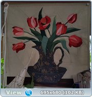 А вот такое панно получилось! Фон - лен, часть зеленого - от мужских рубашек ткань, еще черт те что. Ваза - рукав от женского платья. Мне тогда подруга из Днепропетровска присылала. Она в секонде отоваривалась, распарывала и от каждой вещи один рукав присылала ;D Подоконник - тоже кусок вырезан, дырка от него видна