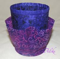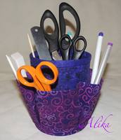Сшилась вот такая корзинка с пятью кармашками высотой 13 см и диаметром окружности 10 см. Шить быстро, легко. Пока не знаю, как будет в эксплуатации, но что-то подобное требовалось, чтобы карандаши, ножницы и т.п. не были хаотично разбросаны вокруг меня  :)