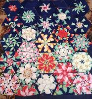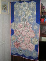Вот не хотела шить калейдоскопы. Но когда увидела картинку показанную Ригма Гольдман, сразу передумала. Ткани у меня было где-то 1,5 метра. Треугольники получились по 13 см. На полноценное покрывало мало получилось шестиугольников, решила сделать панно.  Стежка простая - треугольниками.