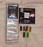 Вот и у меня праздник!!!  :yahoo:  Моя Снегурочка Hemulena, Аленочка, спасибище огромное, угодила :reverans: вот мои подарки-мечталки: набор полос батиков шикарных расцветок, мадейровские ниточки металлик (давно хотела опробовать) и любимый темный шоколад :girl_in_love: и упаковано все было по-новогоднему  :tender: