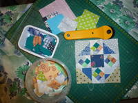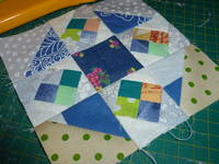 У меня светлое для маленьких деталюх - это не фоновое для блока в целом  :D но так уж вышло, звиняйте, буду шить из сора, иначе куда ж его. И беру всякие тканьки: вот эти треугольные детальки, которые как конфетку окружают четырехклеточки, очень здорово все нивелируют, даже если что-то куда-то поползло, и при выравнивании квадратика в целом все складывается как надо.