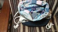 Картонка, Катя. Отчитываюсь по  мешку-рюкзаку. Шить решила сразу, как только ты анонсировала мастер класс,  после январских праздников едем с сестрой в небольшое путешествие -необходимонадо срочно - два. Ткань подобрала сразу - много лет назад участвовала в СП с корейском магазине и вот пригодилось. Внутри  по моему это сатин , изготовления Китай, рисунок  пэчворк :).  Низ - джинсы мужа. Он (муж) большого размера и из его джинсов хорошо шить :). Как ты и рекомендовала, джинс  простегала. Все раскроила.  Технологию прочла - все понятно. НО! Техника шитья у меня хромает.  Карман в рамку как получился, меня не порадовало совсем:( Не дружу я с молниями.  И на машинке ровно закругление прошить - уууу.  Второй мешок-рюкзак пока отложила, он в подарок сестре,  ну и как дарить с такими косяками? Второй карман получился немного лучше: не стала закруглять его, просто по прямой прошила. Сегодня наконец купила веревку и сфотографировала мешок.  Все разложила красиво и ... фотоаппарат отказывается фотографировать - перестал держать заряд, старенький уже. Решила,  что еще тянуть с отчетом нельзя и сделала фото на телефон, вот
