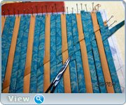 На обоих половинках косметички точно отмечаем начало пришива молнии центр и конец. Намного проще пришивать молнию, длиннее требуемого отверстия. Я использую молнии длиной 60 см (других нет) По одной половинке подкалываете молнию, как на фото, между метками, начиная от ее начала.