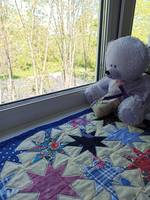 И еще  одно одеяло (36,5х48,5) и две подушечки (18х18) с ушками. Блок типа Крэйзи , так называемая "Танцующая звезда".