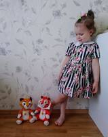 Варвара идет в пятницу на д.р., сшила ей платье. Так Катя таак орала, что она без платья такого же !!! Орет и повторяет-"деть деть" (одеть одеть) .