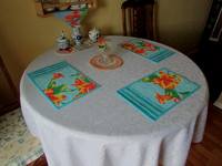 Для меня оптимальный размер ланчмата 27х37 см.На круглый стол укладывается 4 штуки. Вот сейчас на столе лежат 22х35 и кажутся куцыми.