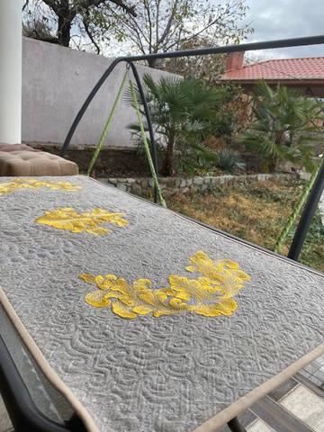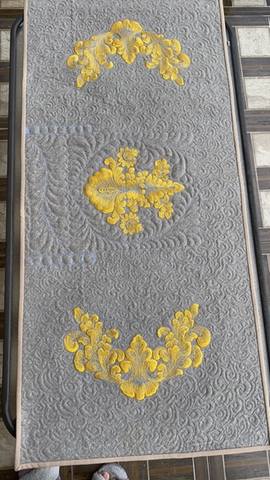 Вот еще сшила на крылечко дорожку, для утреннего кофепития. Простенькая, взяла лен, вышила, простегала на сендвиче с слимтексом150, чтобы потяжелее стала и ветерком осенне-зимним не сдувало. ;)