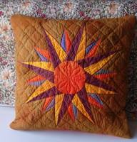 Решила использовать крашеные на двух МК ткани, в процессе шитья поняла, что сюда ляжет только ручная стежка. Стегалось быстро, надеюсь, служить будет долго, теперь живет у мамы в гостиной.
