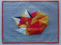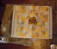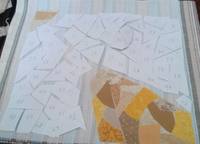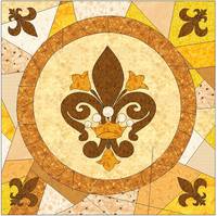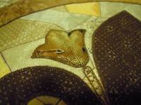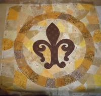 Расскажу историю создания своей работы. Долго не могла найти картинку для вдохновения. Нашла вроде, достала лоскутки и... цвета то все "янтарные". Сразу вспомнила про Янтарную комнату. Нашла фото панели, но меня не устроил герб, его решила заменить королевской лилией. Нарисовала в EQ приблизительную раскладку, распечатала аппликацию. На основу разложила кусочки, прихватив их паутинкой только в серединках (а надо было всю площадь приклеить и сразу закрепить швами, после окончательной стежки кусочки под органзой пошли пузырями  :'( ), закрыла органзой, сверху пришила аппликацию, затем собрала сендвич, простегала по контурам.