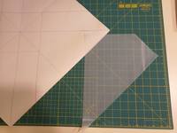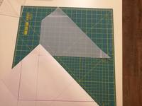 Теперь из этих точек проводим линии параллельно диагоналям. Для наглядности я начертила квадрат вместо принта Теперь обводим получившуюся фигуру каким-нибудь маркером, что бы было видно её через кальку и вырезаем из кальки выкройку.Обязательно на выкройке из кальки надо пометить лицо.