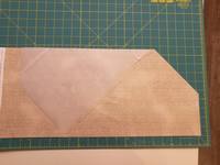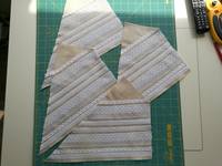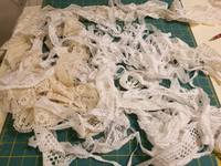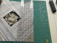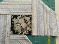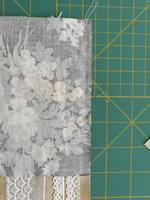 Теперь для нашей красивой тряпочки подбираем ткань компаньон... Фантазии нет предела... Поскольку я нашла два разных красивых отрезка, то под каждый я подбирала компаньоны свои Из ткани-компаньона кроим боковушки. Здесь важно сложить все четыре слоя лицом вверх и выкройку накладывать тоже лицом вверх. Отмечаем маркером линию пришива первого отрезка кружева. У меня это 3/4" от края.Теперь берем свои обрезки кружев, быстро прикидываем порядок расположения