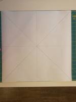 Сначала сделаем выкройку. Для этого на листе нарисуем квадрат с нужными размерами. У меня сторона, примерно 50 см. Проводим диагональные линии и линии, разделяющие стороны квадрата по серединеРазмещаем нашу красивую тряпочку по центру и на диагоналях отмечаем её размерРазмер центрального принта может быть любой. Главное, что бы это был квадрат.