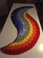 Bazilio, Алиса! Можно использовать и нижнюю часть, если нужна большая салфетка. Т.е. чем выше мы берем нижнюю отметку, тем салфетка будет и короче и уже. Только в этих случаях нужно пересчитывать ширину полос, чтобы самый большой клин вмещал в себя все 8 полос. Моя черно-белая салфетка сделана от отметки 21" Ширина полос в ней другая и размер получился 110 х 80 см! Для проекта я укоротила салфетку и пересчитала ширину полос! Должно было получиться 80 х 50 (или 40) см. Почему у тебя получилось так, как получилось...?  На фото один хвост более вытянутый или это погрешность фото. Я насчитала меньше клиньев, чем было нужно - их должно быть 19.