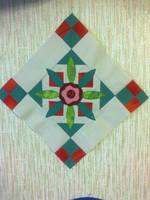 Состоит целиком из HST - раскрой по 8 квадратов 10 см * 10 см каждого цвета - превращаем в HST (должны получиться по 9 см включая припуски) и собираем по схеме. Кто хочет избежать множества швов под аппликацией - можно серединку не из HST шить, а "квадрат в квадрате", и некторые HST заменить "гусями".