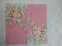 Раскрой: Использовано две ткани, из каждой выкраиваем два квадрата в 16,5 см и два квадрата 9 см. На изнаночной стороне маленьких квадратов проводим диагональ, затем кладем его в угол большого квадрата другого цвета и прострачиваем по этой диагонали. Лишнее обрезаем и потом все четыре квадрата собираем в блок.