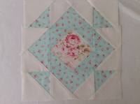 Сшить легче, чем объяснить, как. Но все равно попробую. Раскрой - 2 квадрата розового цвета и два светлых по 14,5 см - превращаем в HST (должны получиться размером в 13,5 см). Далее раскрой 4 светлых квадрата по 7,5 см, расчерчиваем по диагонали и отшиваем розовый уголок как в блоке "снежный шар" (способ еще конвекторными треугольниками называется). Для серединки раскрой - 4 прямоугольника размером 7,5 х 13,5 см + в серединку квадрат 7,5 см. Все собираем по схеме.