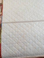 Девочки, про термостёжку, в чём моя любовь к ней? Поскольку я ни сколько не ас в стёжке, а стегать надо, на ней мне это всё гораздо проще дается. Наполнитель спрятан между двух слоёв ткани, не скользит, не сдвигается, хотя я, конечно, всё равно скалываю, вообще всё как-то более стабильно что ли, и итог более формоустойчивый, что на мой взгляд совсем неплохо именно для покрывал. При этом недубово, достаточно пластично. И конечно очень хорошо скрывает неидеальную, ну если вдруг такая :D, изнанку.  И защипов на изнанке нет :D. Конкретно в этом покрывале стегала "тупо мозгами", кто так сказал, не помню, но всегда теперь так называю :D. В общем мне нравится :blush: ;)! Хотя конечно такая затея совсем не пойдёт для пышных, объёмных, мягких одеялок, сами понимаете. Ещё пользовала её же в панно, тоже для стабильности форм. Причём я пользую довольно тонкую и с обеих сторон с тканью, она помягче, а не со спанбондом. И ширина 2,2 м на мой взгляд хороший "+". И ещё один плюс, ну для меня по крайней мере, с лица совершенно точно наполнитель не пролезет :D. Хотя в этот раз обратила внимание, на том покрывале, которому уже 2 года и с изнанки всё хорошо.