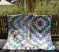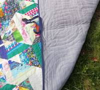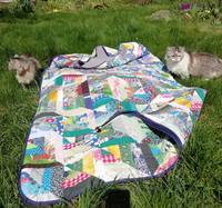 Полосатый рейс закончила стегать в феврале. Пожелания заказчика были необычные - он хотел спальник :o ??? Поэтому под бейку вшила молнию, чтоб можно было застегнуть и получить мешок. Размерчик такой немаленький получился, 200х220см, и пестрое - вырви глаз. На солнышке это все как-то сглаживается, а комнате просто буйство...
