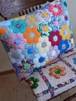 Летом подсела на "гексики", насобирала их из разных тканей, тут и бязь,  и поплин,  и ткань для пэчворка,  размер в один дюйм. Нашила цветов и соорудила  вот такой  комплект, размер одеяла 200*157см, подушка 50*70см.