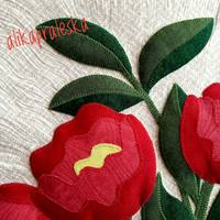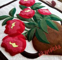 Панно «Пионы», размер 42х62 см. Здесь все просто: аппликация и трапунто. Долго думала, как бы простегать, но вот на ум пришли такие волны, мне понравился результат, хотя в конечном результате после стежки действительно капельку волнит само панно, может, не очень и красиво, но мне вроде и ничего, одариваемым тоже понравилось.