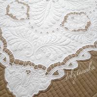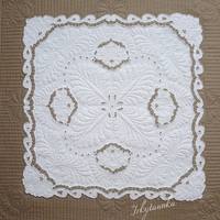 И я с обновкой. ;) Сбылась мечта, сшила квилт с салфеткой ришелье, размер 70*70см, наполнитель слимтекс100, надо бы потолще. ;) Результатом очень довольна, растелила на журнальном столике, хожу любуюсь. :girl_in_love:  Сама салфетка 55*55см, ткань полулен, не очень он мне понравился в уже готовом изделии, буду искать ткань поплотнее.