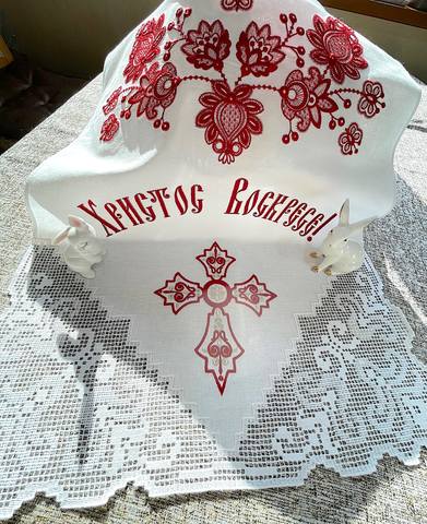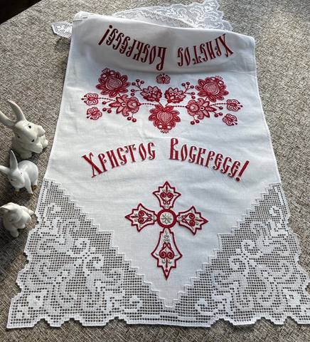Вышито к Пасхе. Машинная вышивка, кружево тоже вышито на машинке, две стыковки. Вроде и не ручная, но тоже повозилась.
