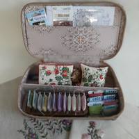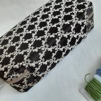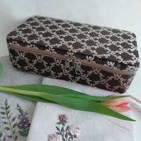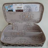 Я все мелочами нелоскутными  балуюсь. Была задача - брать с собой все для мелкой вышивки. Результат - шкатулка 22х11х5см, ткань портьерная.