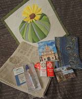 А следом примчался наилюбимейший Кактусёнок от Алёнки- Alika из Бреста с морем подарков. Он так мне понравился, что я его сделала заставкой ЗЕЛЁНОЙ СТРАНЫ в Вернисаже. Верх совершенства шитья по бумаге, хорошая стёжка, идеально подобранные цвета и...главное, он копия моего цветущего кактуса, радующего меня более двадцати пяти лет. К мечте прилагались восхитительные подарки, особенно поразила скатерть  :thank_you2: :preved: Не все сладости дожили до фотосессии  :blush: Вот, любуйтесь вместе со мной  :tender: