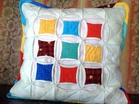Петруччио, Оля! Поправляйся! А я разобралась с кафедральными окнами. Вначале показалось очень трудно. Для пробы использовала цветные китайские лоскуты 10х10 см, давно купленные по-глупости  на Али. ткань очень тонкая. Для ромбов уже взяла ткань получше. Топ оказался гигантским - 75х75.  Сшила из него наволочку (см. тыльную часть). Зато поняла что к чему. Будет время - зимой  сошью что-нибудь поизящнее. Спасибо за МК и новый навык. :girl_in_love: :tender: :good2: